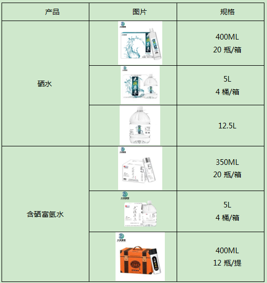 旗下拥有硒水、含硒富氢水和陨石水等产品,并提供小瓶装和大桶装多种规格。